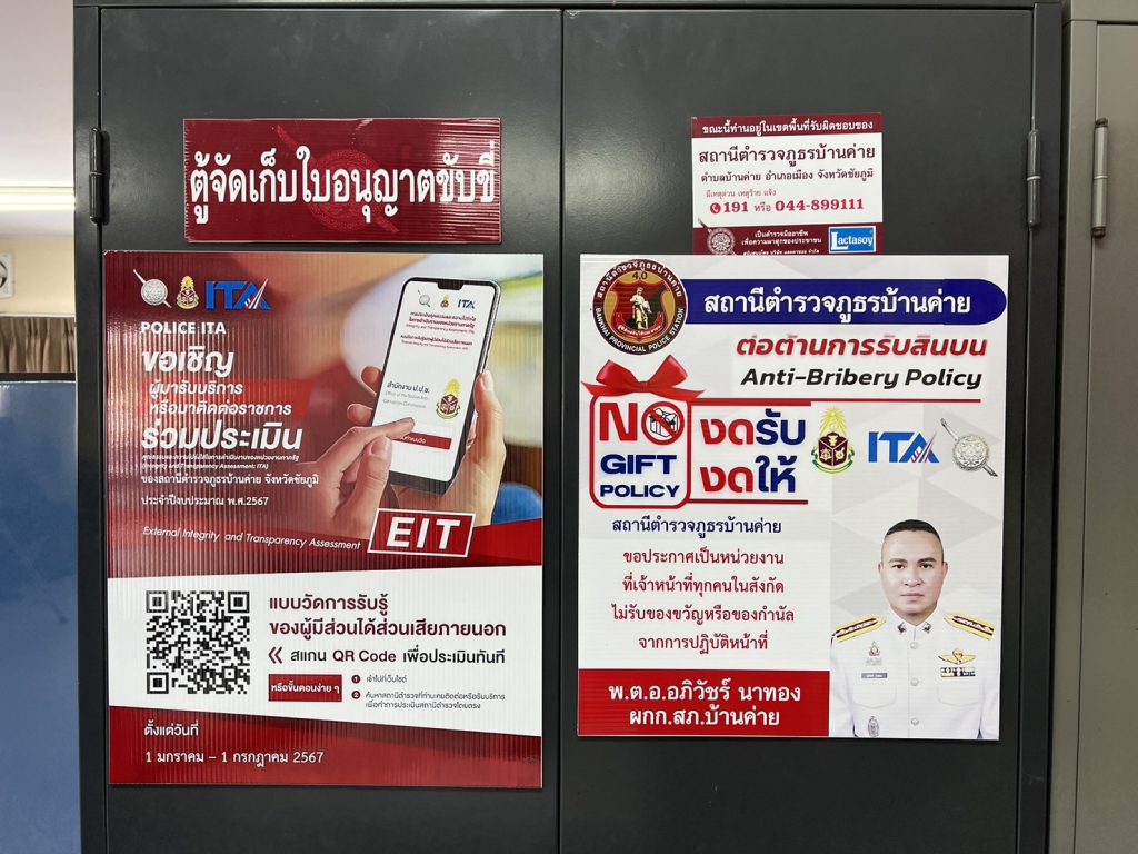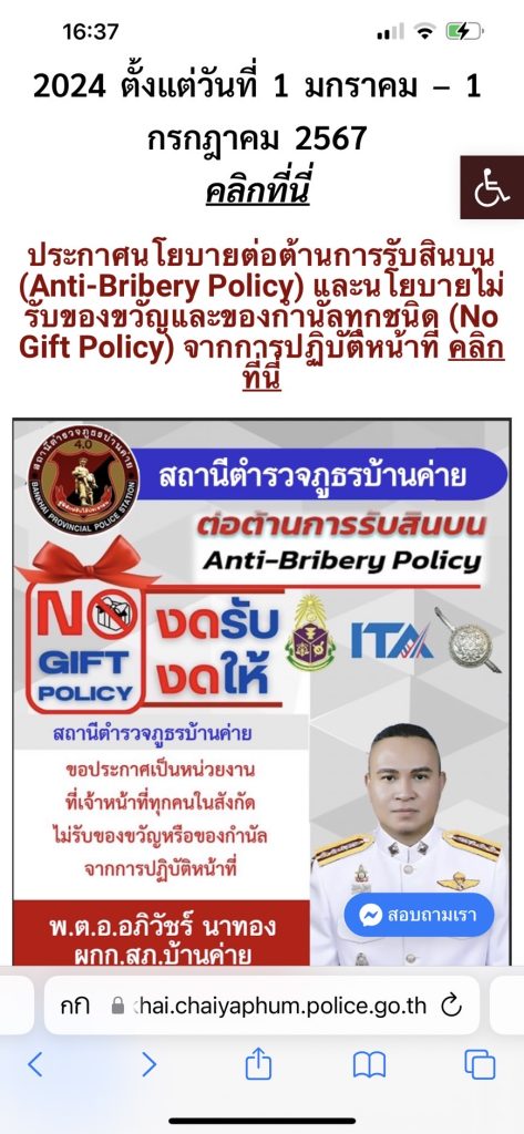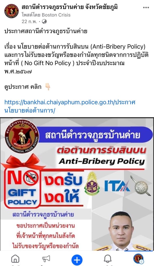 จัดทําประชาสัมพันธ์ประกาศสถานีตำรวจภูธรบ้านค่าย เรื่อง นโยบายต่อต้านการรับสินบน (Anti-Bribery Policy) และการไม่รับของขวัญหรือของกำนัลทุกชนิดจากการปฏิบัติหน้าที่ ( No Gift No Policy ) ประจำปีงบประมาณ พ.ศ.๒๕๖๗