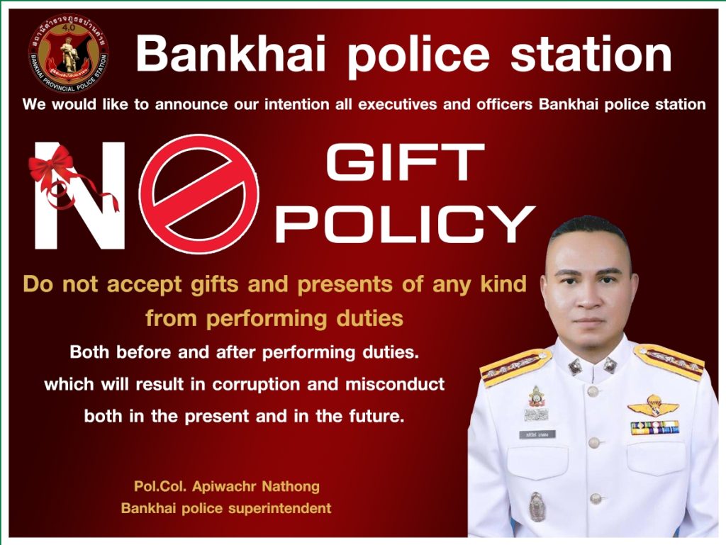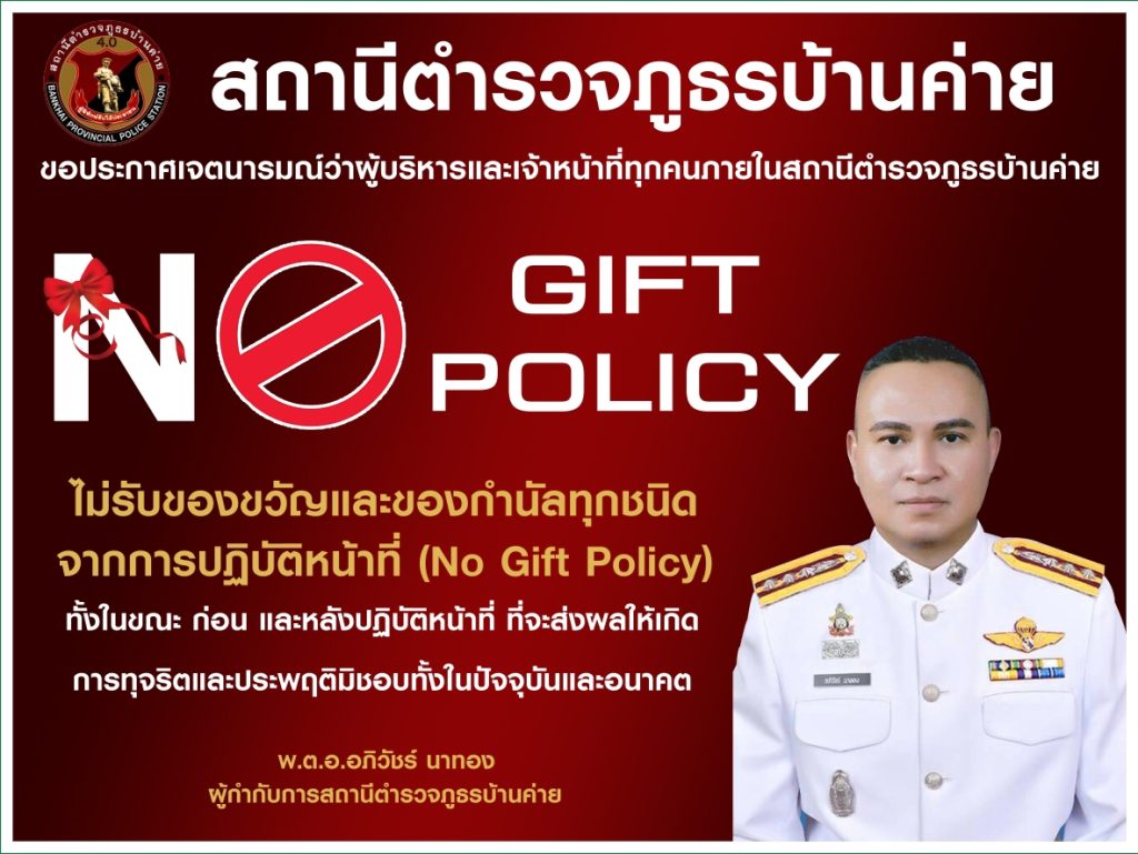 สื่อประชาสัมพันธ์ (infographic) นโยบายไม่รับของขวัญและ ของกำนัลทุกชนิด (No Gift Policy) จากการปฏิบัติหน้าที่ ของสถานีตำรวจภูธรบ้านค่าย