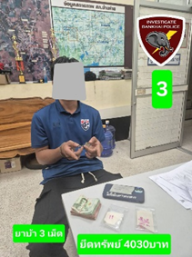 จับกุมผู้ต้องหา 1 ราย ของกลาง ยาบ้า 3 เม็ด ยึดทรัพย์ 1 รายการ
