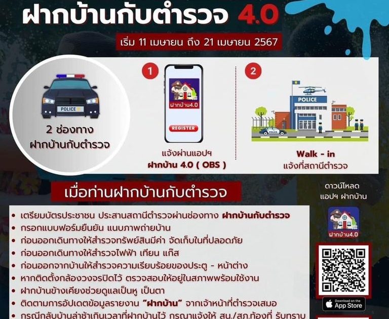 สงกรานต์ 2567 ฝากบ้านกับตำรวจ 4.0 8 เมษายน 2567 โดย sornram / ข่าวประชาสัมพันธ์,ข่าวกิจกรรม,ข่าวประชาสัมพันธ์,ข่าวประชาสัมพันธ์,ข่าวฝากประชาสัมพันธ์ ฝากบ้านกับตำรวจ วางแผนก่อนเดินทางช่วงสงกรานต์ 2567 และฝากบ้านไว้ ให้ตำรวจช่วยดูแล อัปเดต 2 ช่องทางฝากบ้านกับตำรวจ 1. แอปฯ ฝากบ้าน 4.0 ดาวน์โหลดผ่านแอปสโตร์ หรือ กูเกิ้ลเพลย์ 2.วอล์กอินที่สถานีตำรวจใกล้บ้าน แนะนำสิ่งที่ต้องเตรียมพร้อม อาทิ สำรวจทรัพย์สินมีค่าจัดเก็บให้ปลอดภัย สำรวจไฟฟ้า ธูป เทียน เพื่อป้องกันอัคคีภัย สำรวจความเรียบร้อยของประตู หน้าต่าง ฯลฯ #ฝากบ้านกับตำรวจ #สงกรานต์2567 #สำนักงานตำรวจแห่งชาติ #Royalthaipolice FacebookFacebookXXLINELine